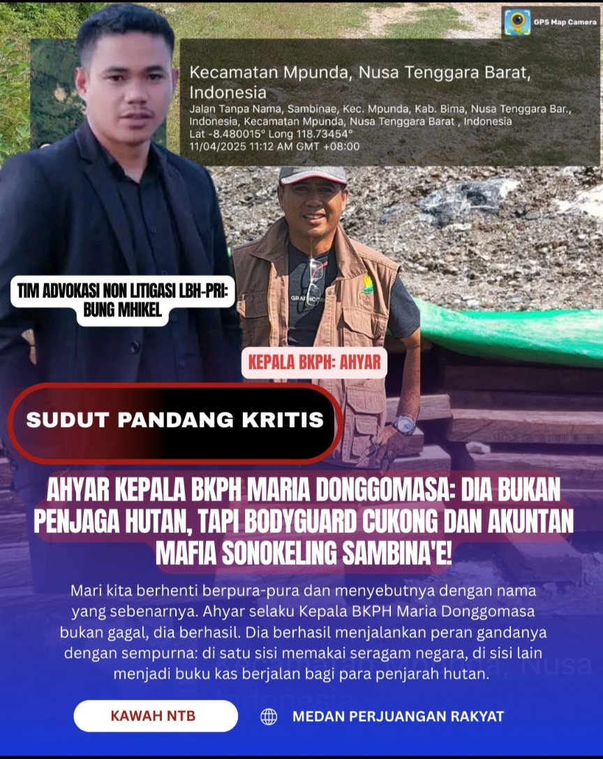 BIMA, 24 Agustus 2025 || Kawah NTB – Tabir kepalsuan itu akhirnya robek. Kepala BKPH Maria Donggomasa, Ahyar, bukanlah abdi negara yang gagal, melainkan aktor utama dalam sebuah drama pengkhianatan ekologis. Bung Mhikel dari Tim Advokasi Non-Litigasi Lembaga Bantuan Hukum Peduli Rakyat Indonesia (LBH-PRI) dengan tegas menyatakan bahwa Ahyar adalah predator berseragam yang perannya lebih mirip bodyguard pribadi dan akuntan bagi mafia Sonokeling daripada seorang penjaga hutan.