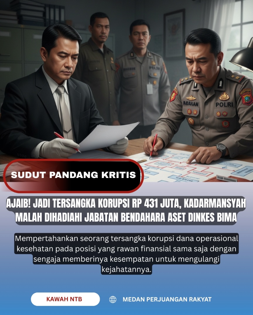 Ironi terbesar dalam sandiwara penegakan hukum ini adalah status salah satu tersangka, Kadarmansyah, S.Sos. Alih-alih dinonaktifkan untuk kepentingan penyidikan dan menjaga integritas birokrasi, ia justru masih aktif dan dipercaya oleh Dinas Kesehatan (Dinkes) dan Bupati Bima untuk menduduki jabatan strategis sebagai Bendahara Aset di Dinas Kesehatan Kabupaten Bima.