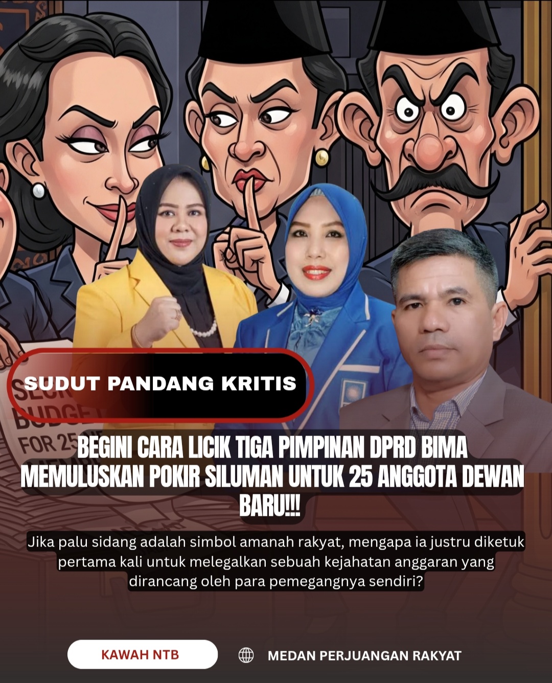 BIMA, 12 September 2025 || Kawah NTB – Sebuah noda hitam pekat telah mencoreng wajah lembaga legislatif Kabupaten Bima sejak hari pertama pelantikan. Alih-alih menyusun agenda pro-rakyat, Tiga Pimpinan DPRD Bima Perusak Marwah DPRD Kabupaten Bima diduga kuat justru menjadikan hari-hari pertama mereka di kursi kekuasaan untuk merancang sebuah kejahatan anggaran. Skema Pokir Siluman yang dibagikan kepada 25 anggota dewan baru bukanlah sebuah kekhilafan administrasi, melainkan sebuah operasi politik yang diduga telah didesain secara matang, dingin, dan mengkhianati seluruh pemilih mereka. Saat rakyat menaruh harapan di pundak mereka, haruskah tindakan pertama para pimpinan dewan justru menjadi sebuah persekongkolan jahat untuk mengamankan proyek ilegal?