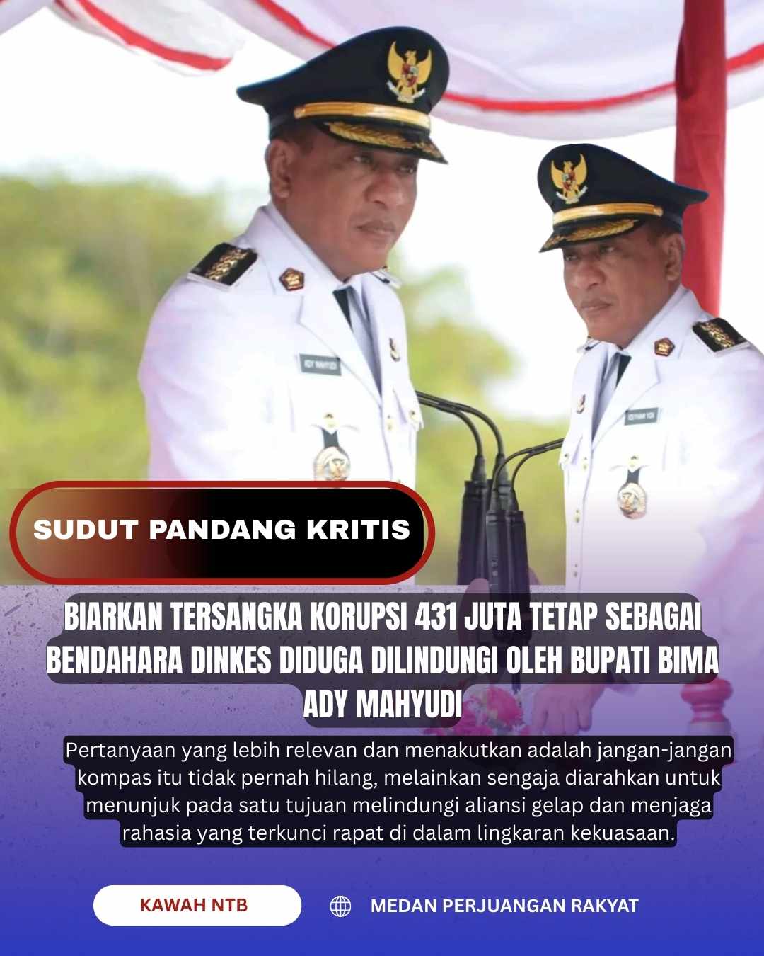 BIMA, 25 September 2025 || Kawah NTB – Naif sekali jika kita masih menganggap apa yang terjadi di Kabupaten Bima adalah sekadar cermin dari krisis etika seorang pemimpin. Analisis semacam itu terlalu sopan dan terlalu dangkal untuk menjelaskan teater kemunafikan yang dipertontonkan oleh Bupati Bima, Ady Mahyudi. Mempertahankan Kadarmansyah, seorang tersangka korupsi dana kesehatan, di posisinya yang basah bukanlah lagi sebuah kegagalan moral, melainkan sebuah desain. Ini adalah sebuah deklarasi perang terbuka terhadap akal sehat, yang mengisyaratkan adanya sebuah persekongkolan jahat yang busuknya tercium hingga ke sudut-sudut nurani publik.