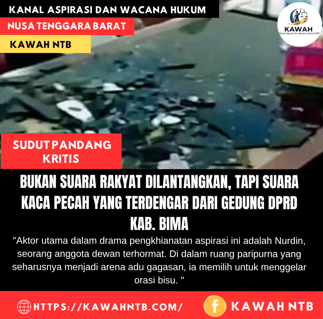Bima, 3 Agustus 2025 || Kanal Aspirasi dan Wacana Hukum (Kawah) NTB – Ada sebuah kontrak suci antara rakyat dan wakilnya di gedung parlemen. Rakyat meminjamkan suaranya, menitipkan aspirasinya untuk diperdebatkan, diperjuangkan, dan diwujudkan melalui kata-kata. Namun di Kabupaten Bima, sebuah inovasi politik yang mengerikan baru saja dipatenkan: ketika kata-kata dianggap tak lagi cukup, sebuah meja kaca pun diutus untuk “berbicara” melalui ledakan amarah. Dan suaranya, yang berderak pecah, kini terdengar lebih nyaring daripada keadilan itu sendiri.