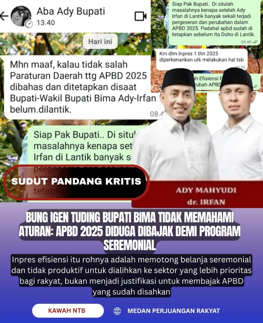 BIMA, 14 September 2025 || Kawah NTB – Bupati Bima, Ady Mahyudi, kini berada di bawah sorotan tajam setelah dituding gagal paham dan secara keliru menafsirkan Instruksi Presiden (Inpres) No. 1 Tahun 2025 tentang efisiensi anggaran. Alih-alih digunakan untuk menghemat uang negara, Inpres tersebut justru diduga dijadikan sebagai “kunci inggris” ilegal untuk membongkar paksa Anggaran Pendapatan dan Belanja Daerah (APBD) 2025 yang telah sah dan mengikat secara hukum.