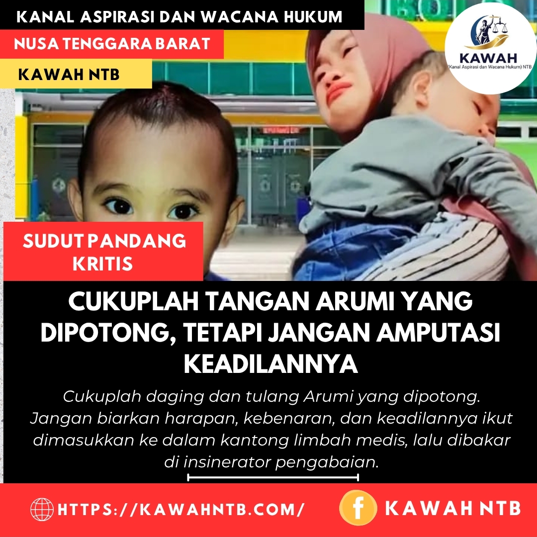 Bima, 26 Juli 2025 || Kanal Aspirasi dan Wacana Hukum (Kawah) NTB – Operasi pertama telah sukses digelar di ruang medis: tangan mungil Arumi kini tinggal kenangan. Kini, panggung telah disiapkan untuk operasi kedua, sebuah prosedur yang jauh lebih canggih dan tak berdarah, digelar di ruang-ruang rapat ber-AC dan koridor hukum yang senyap. Para ahli bedah narasi telah mengenakan jubah kebesaran mereka, siap dengan pisau bedah paling tajam: retorika hukum dan mantra sakti “sesuai prosedur”. Target operasinya kali ini bukan lagi jaringan nekrotik, melainkan sesuatu yang jauh lebih merepotkan: Keadilan.