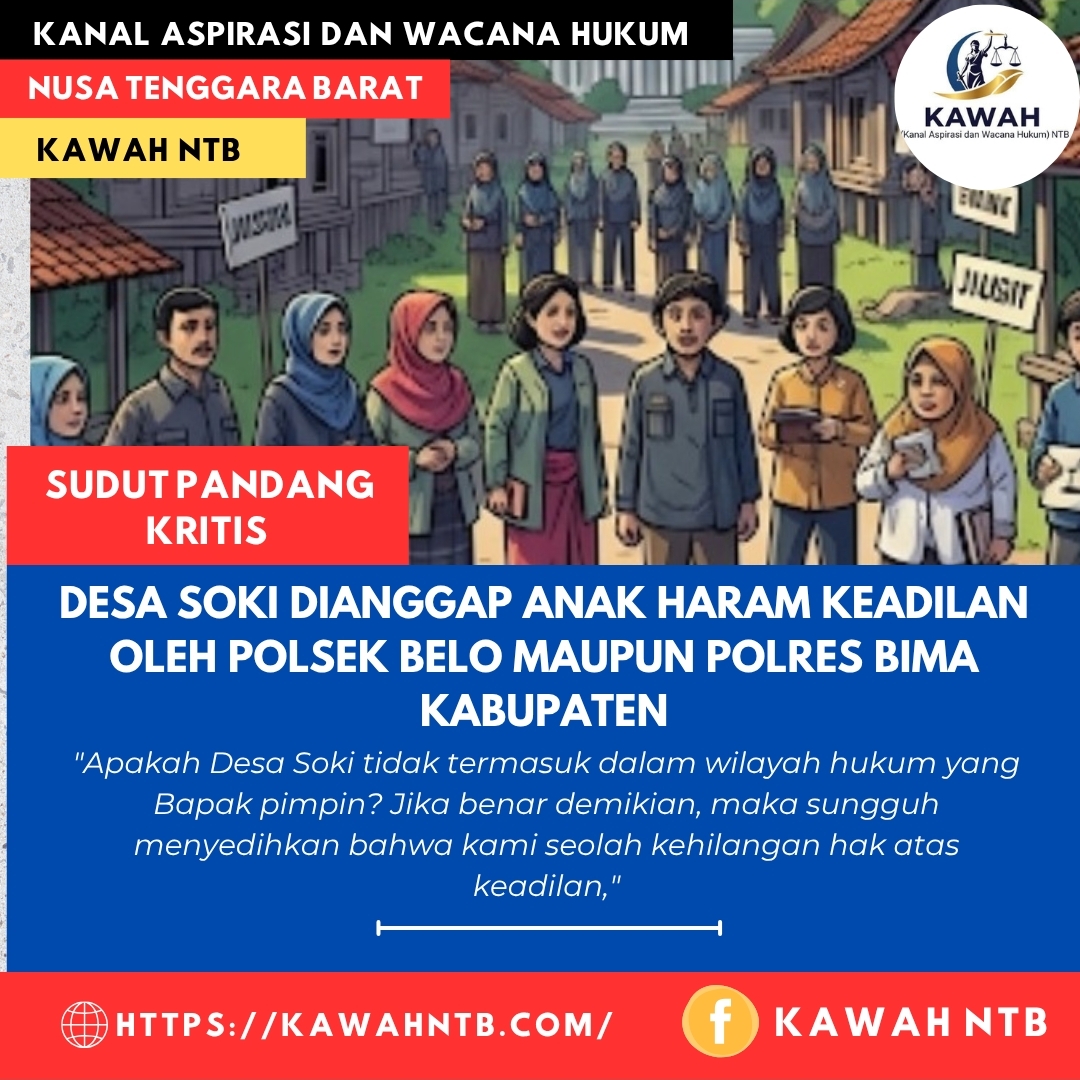 Bima, 26 Juli 2025 || Kanal Aspirasi dan Wacana Hukum (Kawah) NTB – Gelombang frustrasi dan kemarahan memuncak di Desa Soki, Kecamatan Belo, Kabupaten Bima, Nusa Tenggara Barat. Warga menuding keras aparat penegak hukum, khususnya Polsek Belo dan Polres Bima Kabupaten, telah menganaktirikan mereka dalam penegakan supremasi hukum. Puncak dari kekecewaan ini meledak menyusul mandeknya penyelidikan kasus dugaan pembunuhan Sahrul Ajwari dan serentetan peristiwa kriminal yang seolah menempatkan Desa Soki sebagai zona tanpa hukum.