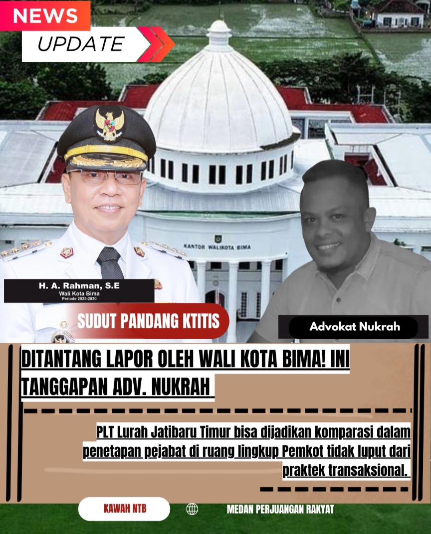 BIMA, 4 November 2025 || Kawah NTB – Eskalasi dugaan skandal mahar jabatan Lurah Jatibaru Timur senilai Rp 45 juta semakin memanas. Alih-alih mereda, bantahan keras dan tantangan lapor saja dari Walikota Bima, H.A. Rahman, justru menyulut respon yang lebih tajam dari Advokat Bima, Bung Nurkrah.