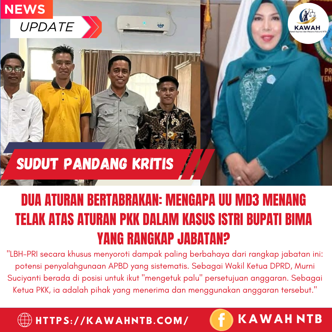 BIMA, 13 Agustus 2025 || Kawah NTB – Polemik hukum mengenai jabatan ganda Wakil Ketua II DPRD Bima, Murni Suciyanti, memasuki babak akhir perdebatan. Meskipun sempat muncul argumen tandingan untuk membela posisinya, analisis hukum mendalam menunjukkan bahwa argumen tersebut cacat secara logika dan tidak mampu membatalkan larangan mutlak dalam Undang-Undang.
