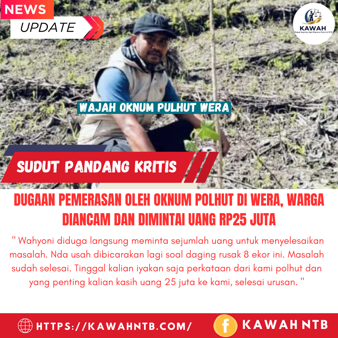 BIMA 17 Agustus 2025 || Kawah NTB – Seorang oknum Polisi Kehutanan (Polhut) yang bertugas di Kecamatan Wera, yang diidentifikasi bernama Wahyoni alias Yonif, diduga melakukan upaya pemerasan terhadap sekelompok warga. Peristiwa ini terjadi di kawasan Gunung Sangiang pada Agustus 2024 lalu.