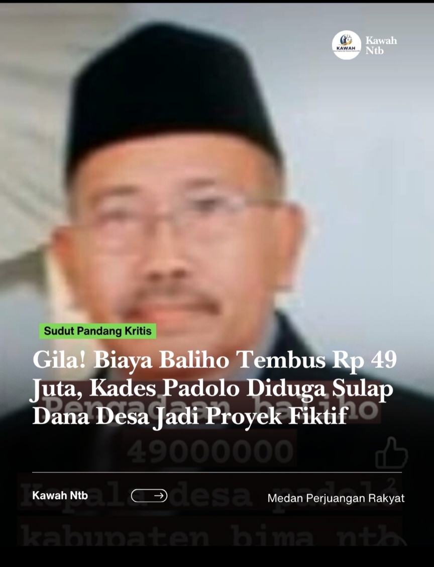 BIMA, 30 November 2025 || Kawah NTB – Masyarakat Kabupaten Bima kini menyoroti secara tajam realisasi penggunaan Dana Desa (DD) Tahun Anggaran 2024 di Desa Padolo, Kecamatan Woha, Kabupaten Bima. Berdasarkan informasi yang diperoleh dari masyarakat setempat, ditemukan sejumlah kejanggalan serius mulai dari dugaan proyek fiktif hingga mark-up anggaran yang nilainya mencapai ratusan juta rupiah.