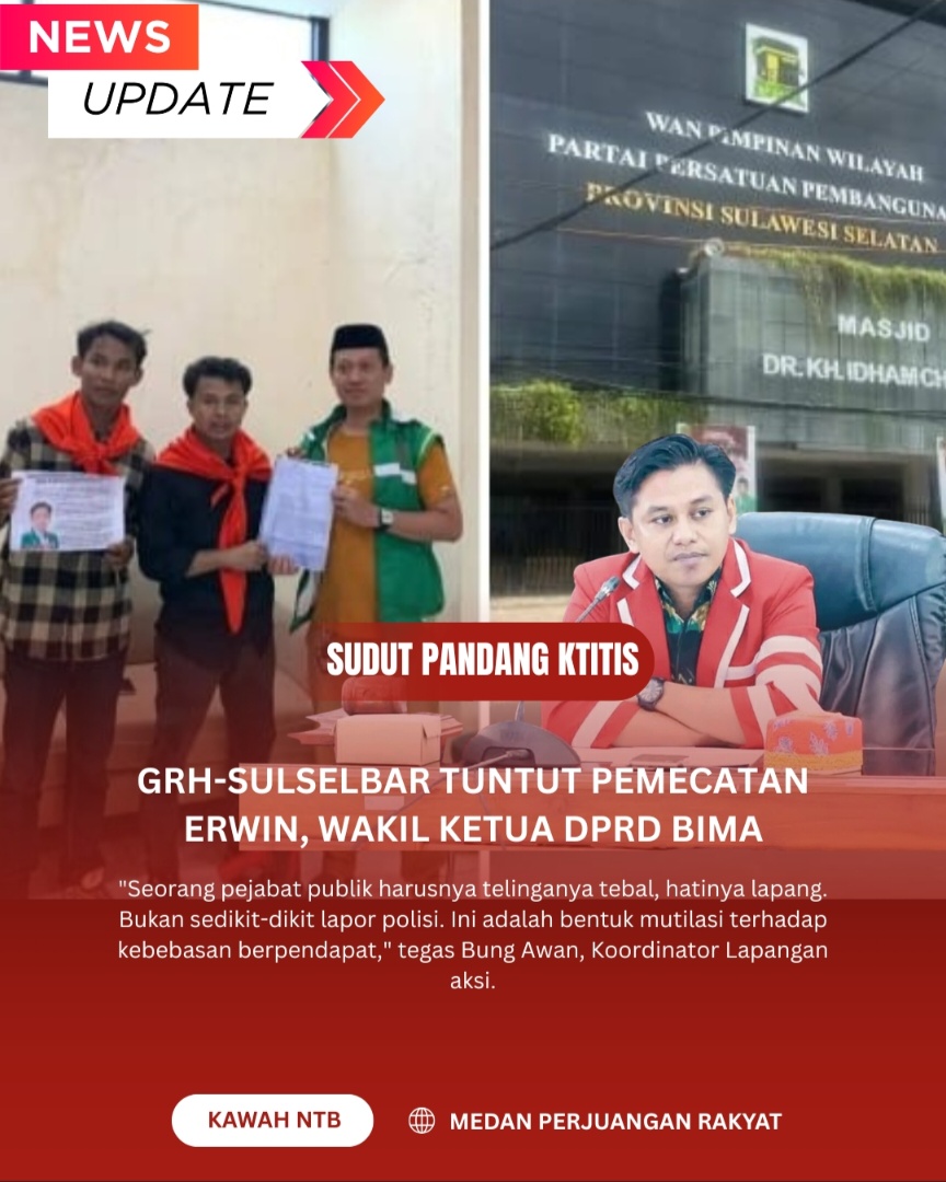 GRH-Sulselbar menilai Erwin telah mencederai marwah demokrasi dengan tindakannya yang diduga mencoba membungkam suara-suara kritis dari elemen masyarakat dan aktivis di Bima.
