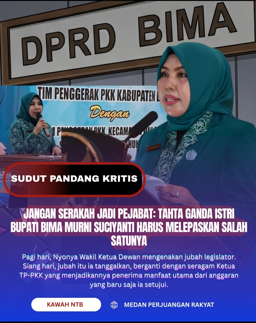 Keberanian Murni Suciyanti, istri Bupati Bima Ady Mahyudi, untuk menduduki dua kursi basah sebagai Pimpinan Legislatif dan Ketua TP-PKK kini tak lagi dilihat sebagai konflik kepentingan semata. Ini adalah deklarasi terbuka arogansi kekuasaan; sebuah pesan pongah bahwa hukum dan etika bisa dengan mudah dilipat dan dimasukkan ke dalam saku. Lonjakan anggaran TP-PKK sebesar 200%, dari Rp 500 juta menjadi Rp 1,5 Miliar, adalah bukti nyata betapa ampuhnya mantra tersebut saat dirapalkan dari singgasana kekuasaan ganda.