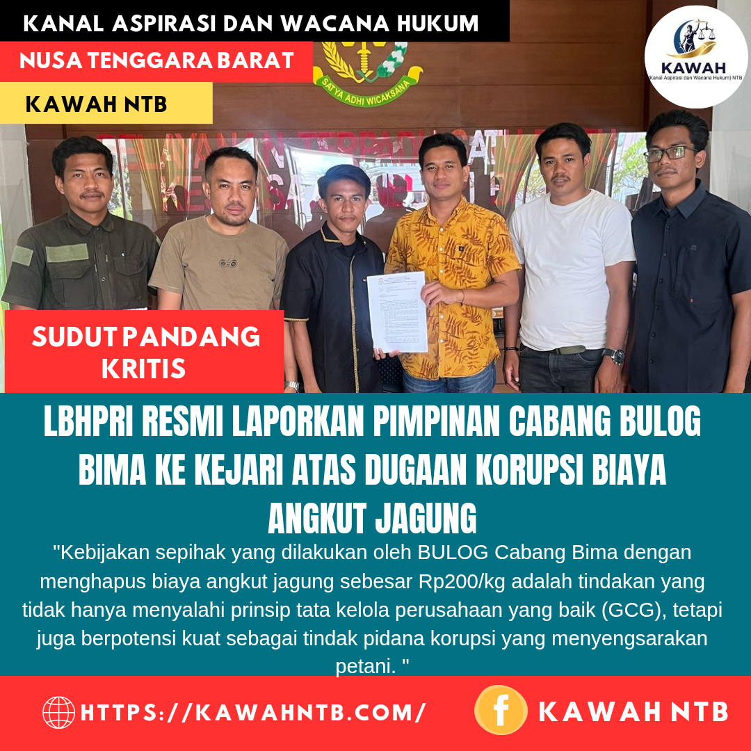 Bima, 1 Agustus 2025 || Kanal Aspirasi dan Wacana Hukum (Kawah) NTB – Lembaga Bantuan Hukum Peduli Rakyat Indonesia (LBHPRI) secara resmi melaporkan Pimpinan Cabang Perum BULOG Bima ke Kejaksaan Negeri (Kejari) Raba Bima atas dugaan tindak pidana korupsi. Laporan ini terkait kebijakan penghapusan biaya angkut jagung yang dinilai merugikan keuangan negara hingga senilai Rp4,3 miliar dan berdampak langsung pada kesejahteraan petani.