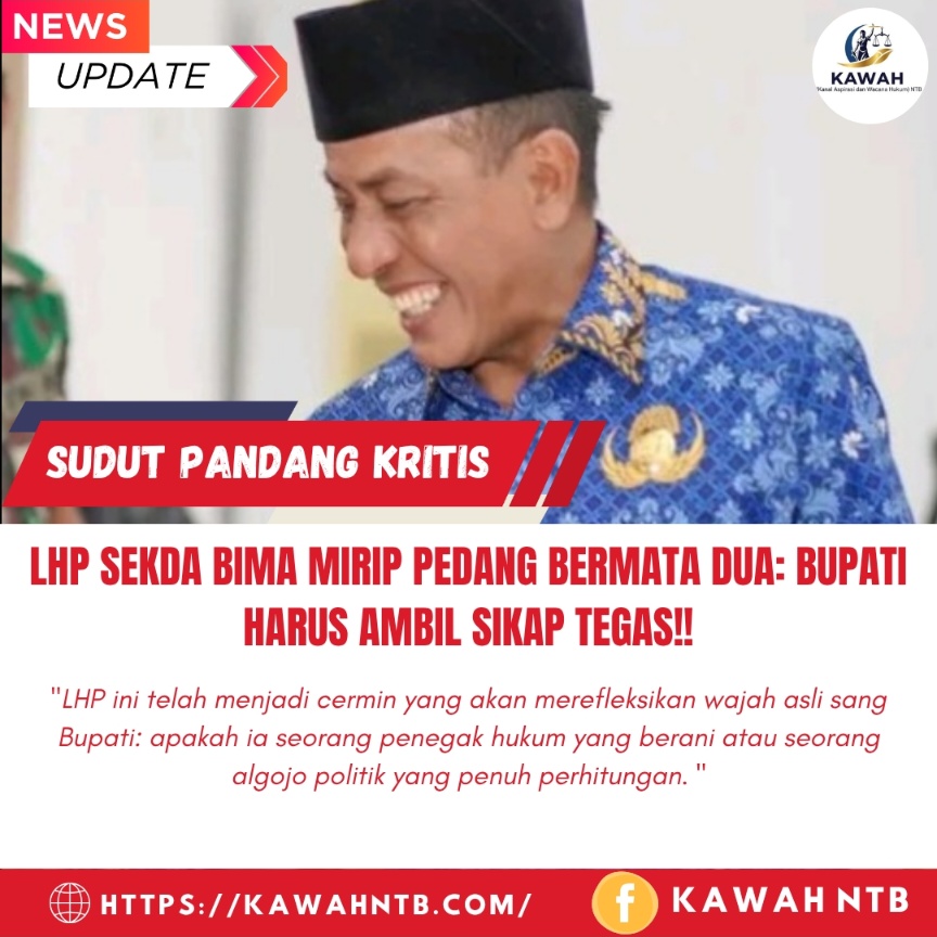 BIMA, 11 Agustus 2025 || Kawah NTB – Polemik Laporan Hasil Pemeriksaan (LHP) atas Sekretaris Daerah (Sekda) Bima, Ade Linggiardi, telah sampai pada titik puncaknya. Dokumen ini kini bukan lagi sekadar kertas hasil audit; ia telah bertransformasi menjadi sebuah pedang bermata dua di tangan Bupati Bima, Ady Mahyudi. Langkah selanjutnya yang ia ambil tidak akan lagi mendefinisikan nasib Sekda, melainkan akan menjadi vonis definitif atas karakter dan warisan kepemimpinan Bupati Ady Mahyudi sendiri.