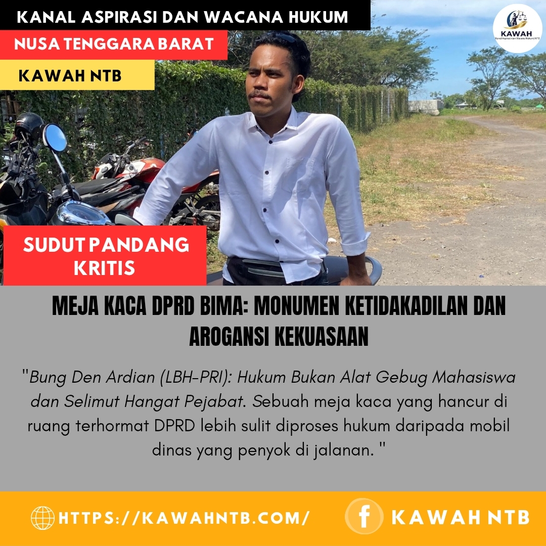 Bima, 3 Agustus 2025 || Kanal Aspirasi dan Wacana Hukum (Kawah) NTB – Tirai sandiwara hukum di Bima telah kami robek paksa! Panggung yang katanya terhormat itu kini mempertontonkan borok paling menjijikkan dari sistem yang timpang. Di hadapan mata kita semua, terbukti sudah: sebuah meja kaca yang hancur di ruang terhormat DPRD lebih sulit diproses hukum daripada mobil dinas yang penyok di jalanan. Inilah potret telanjang sebuah republik yang hukumnya tunduk di bawah sepatu para penguasa.