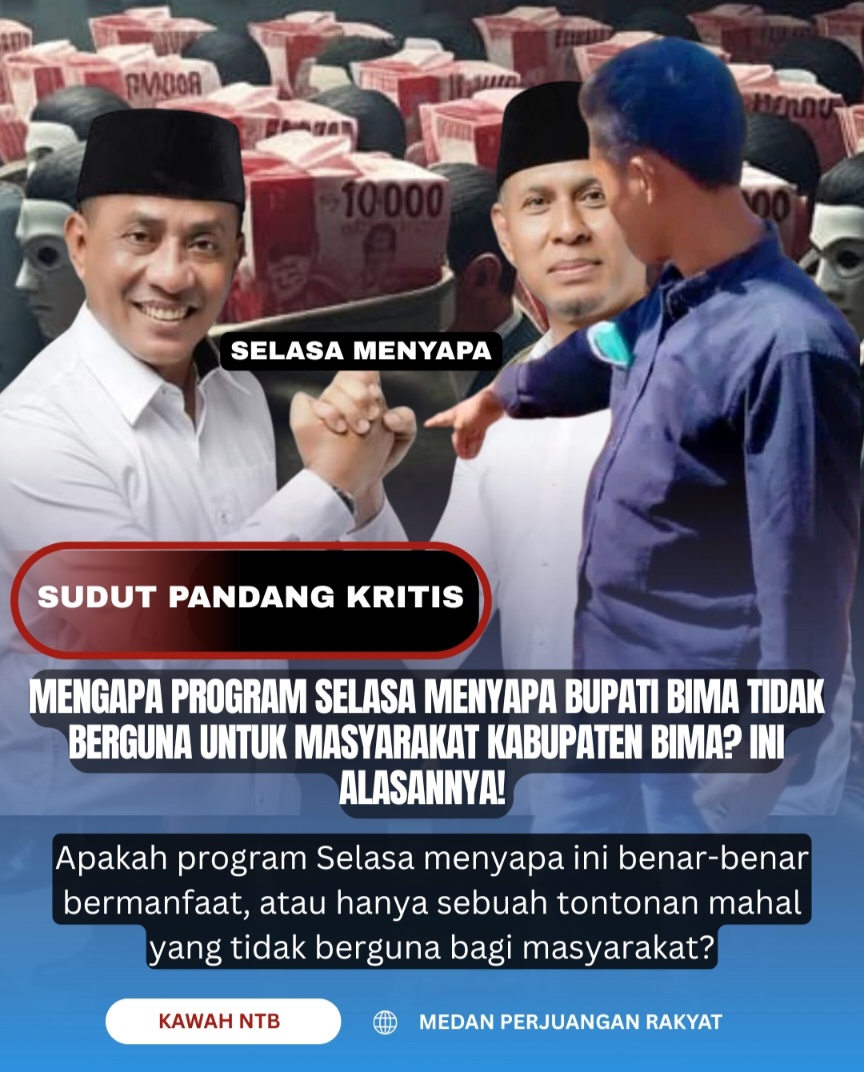 BIMA, 12 September 2025 || Kawah NTB – Di tengah klaim keberhasilan dan liputan seremonial yang masif, program Selasa Menyapa yang diinisiasi Bupati Bima Ady Mahyudi kini menghadapi pertanyaan fundamental, apakah program Selasa Menyapa ini benar-benar bermanfaat, atau hanya sebuah tontonan mahal yang tidak berguna bagi masyarakat?