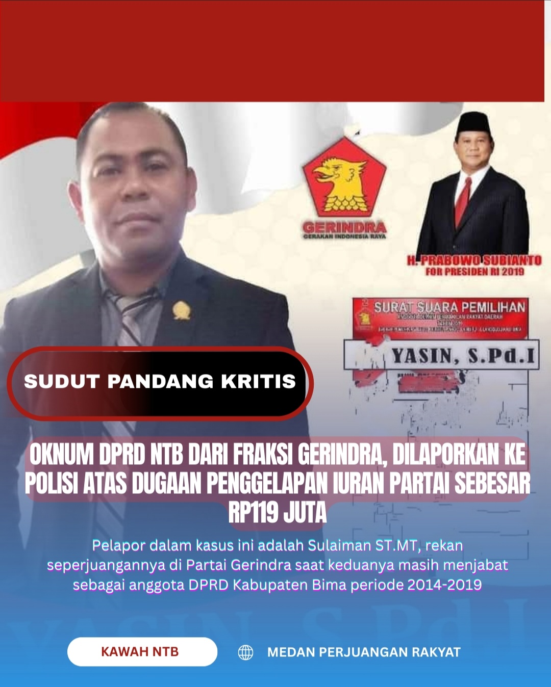 BIMA, 4 September 2025 || KAWAH NTB – Panggung politik Nusa Tenggara Barat (NTB) kembali diguncang oleh skandal memalukan yang menyeret nama seorang legislator terhormat. Yasin S.Pd.i., oknum anggota DPRD Provinsi NTB, secara resmi dilaporkan ke Polres Bima Kota atas dugaan tindak pidana penggelapan dan penipuan. Tak tanggung-tanggung, dana yang diduga “ditelan” mencapai Rp119 juta, yang merupakan uang iuran partai yang seharusnya menjadi bukti loyalitas seorang kader.