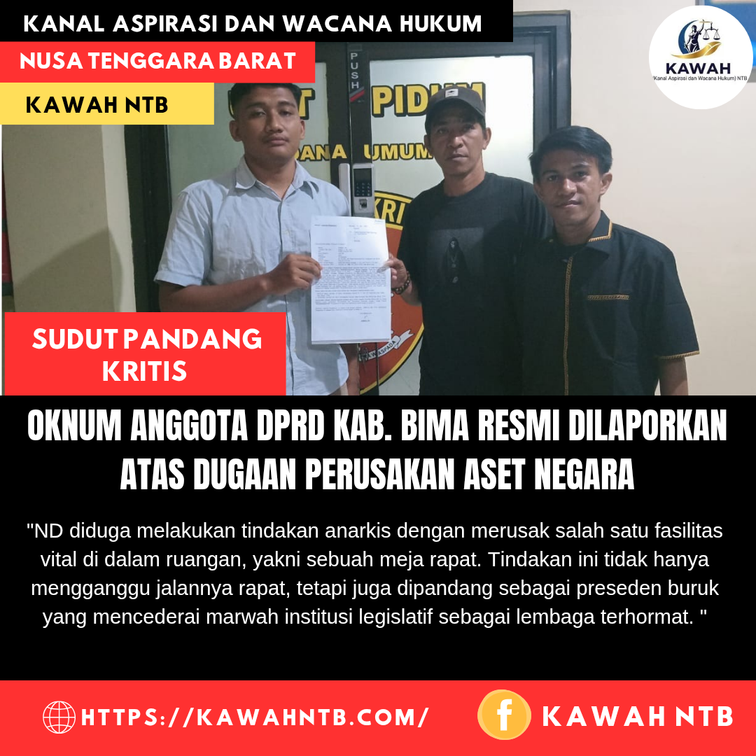 Bima, 1 Agustus 2025 || Kanal Aspirasi dan Wacana Hukum (Kawah) NTB – Eskalasi dinamika politik di Kabupaten Bima mencapai puncaknya ketika seorang oknum Anggota Dewan Perwakilan Rakyat Daerah (DPRD) berinisial ND, secara resmi dilaporkan ke Sentra Pelayanan Kepolisian Terpadu (SPKT) Polres Bima Kota pada hari Kamis, 31 Juli 2025. Laporan ini dilayangkan oleh perwakilan masyarakat atas dugaan tindak pidana perusakan barang milik negara yang terjadi di dalam ruang rapat paripurna DPRD Kabupaten Bima.
