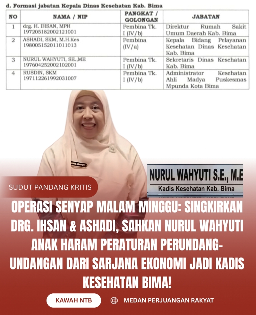 OPERASI SENYAP MALAM MINGGU: Singkirkan drg. Ihsan & Ashadi, Sahkan Nurul Wahyuti Anak Haram Peraturan Perundang-undangan Dari Sarjana Ekonomi Jadi Kadis Kesehatan Bima!