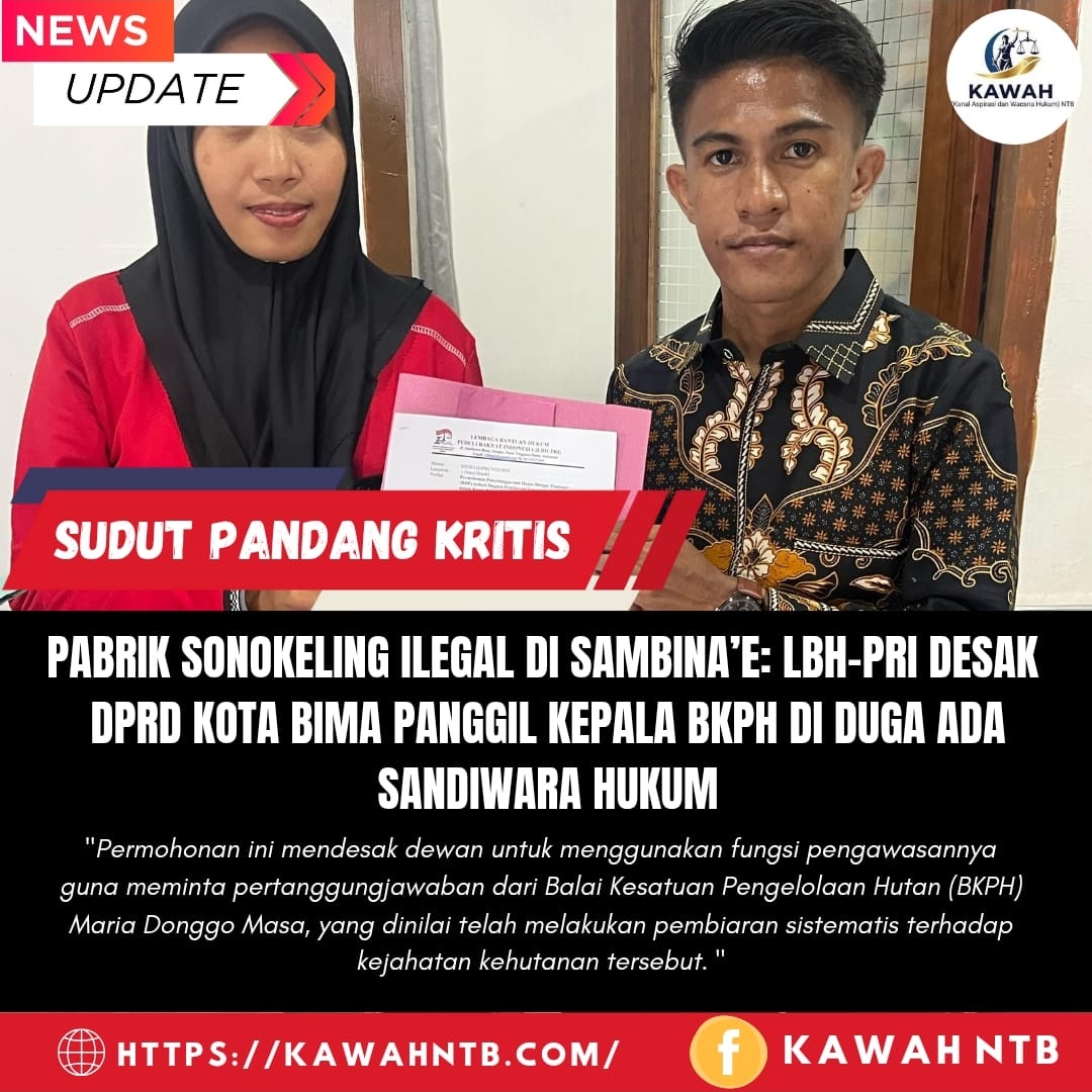 Bima, 8 Agustus 2025 || Kanal Aspirasi dan Wacana Hukum (Kawah) NTB – Skandal lingkungan terkait pabrik pengolahan kayu sonokeling ilegal berskala besar di wilayah Sambina’e, Kota Bima, memasuki babak baru. Lembaga Bantuan Hukum Peduli Rakyat Indonesia (LBH-PRI), yang bertindak atas nama Aliansi Masyarakat Peduli Hutan Bima, secara resmi melayangkan surat permohonan Rapat Dengar Pendapat (RDP) kepada DPRD Kota Bima.
