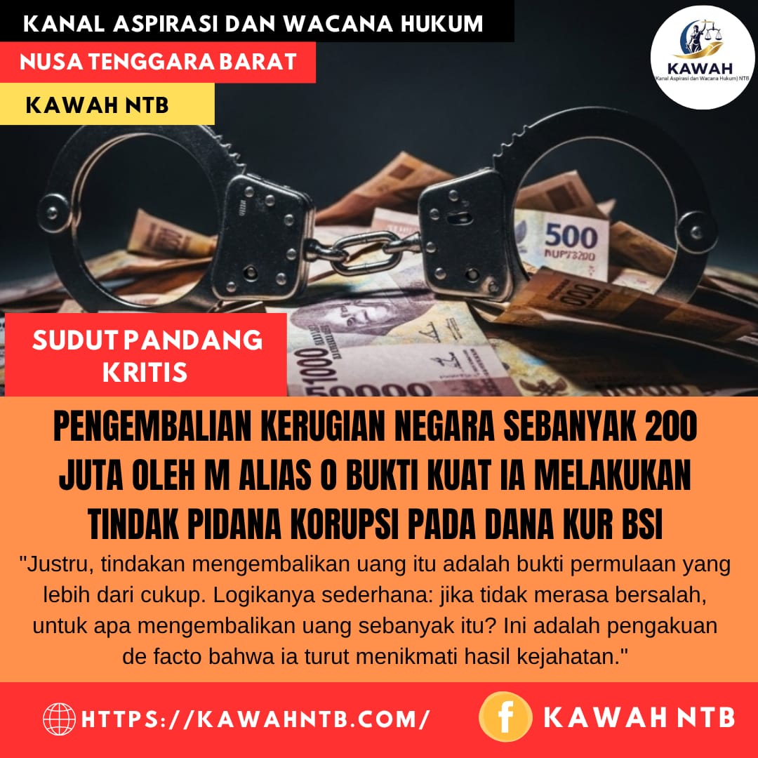 Bima, 3 Agustus 2025 || Kanal Aspirasi dan Wacana Hukum (Kawah) NTB – Babak baru dalam skandal korupsi dana Kredit Usaha Rakyat (KUR) BSI di Bima kini berpusat pada satu tindakan krusial: pengembalian kerugian negara sebesar Rp200 juta oleh M alias O. Alih-alih meredam kasus, langkah yang diambil oleh terduga otak intelektual ini justru dipandang oleh para aktivis hukum sebagai bukti terkuat dan pengakuan tidak langsung atas keterlibatannya dalam tindak pidana korupsi.