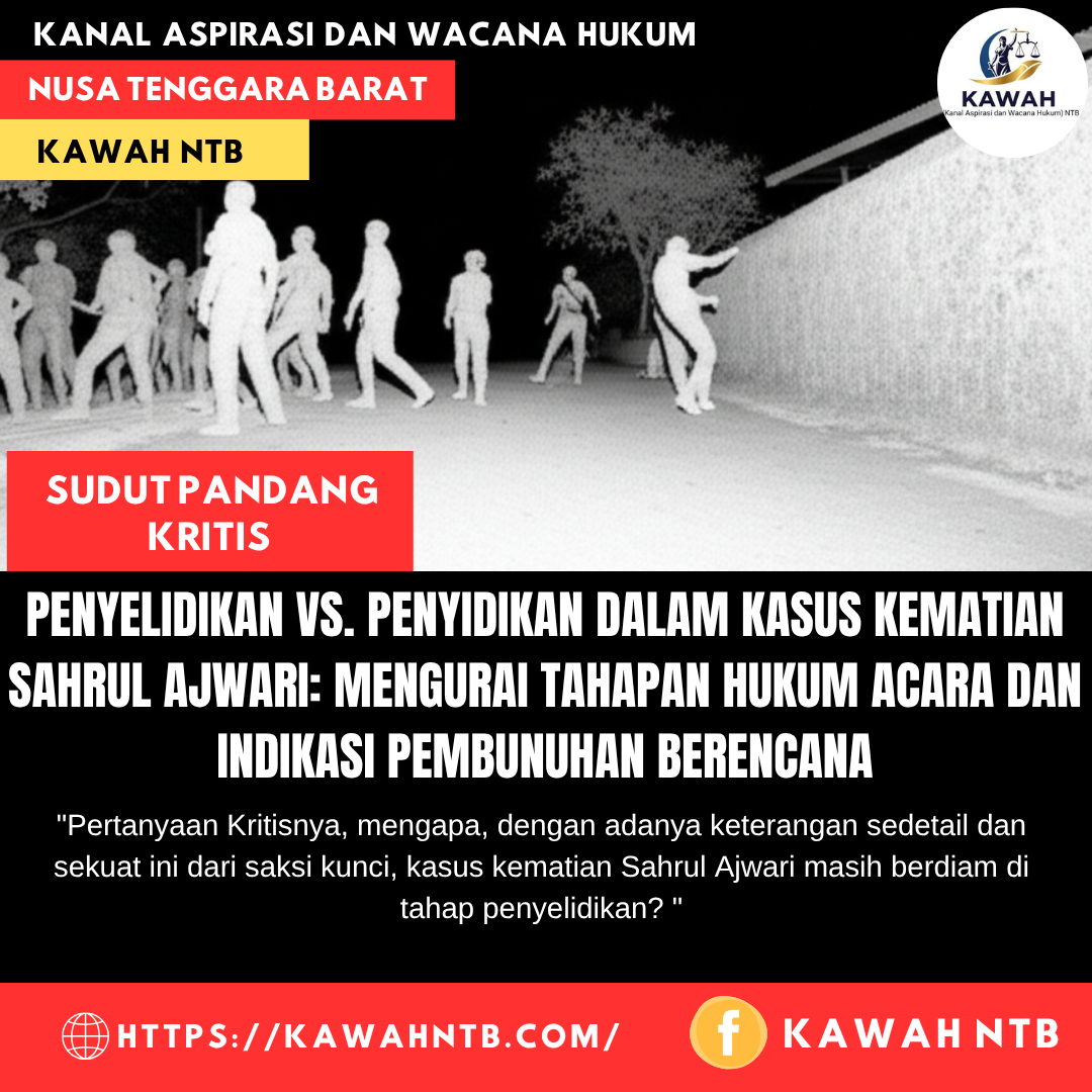 Bima, 30 Juli 2025 || Kanal Aspirasi dan Wacana Hukum (Kawah) Ntb — Kasus kematian Sahrul Ajwari yang masih terkatung-katung di tahap penyelidikan di Polres Bima Kota kembali memantik diskusi mendalam di kalangan masyarakat mengenai perbedaan krusial antara penyelidikan dan penyidikan dalam Kitab Undang-Undang Hukum Acara Pidana (KUHAP). Pemahaman ini menjadi penting, terutama setelah munculnya kronologi detail dari saksi kunci yang mengarah pada dugaan kuat adanya tindak pidana pembunuhan terencana.