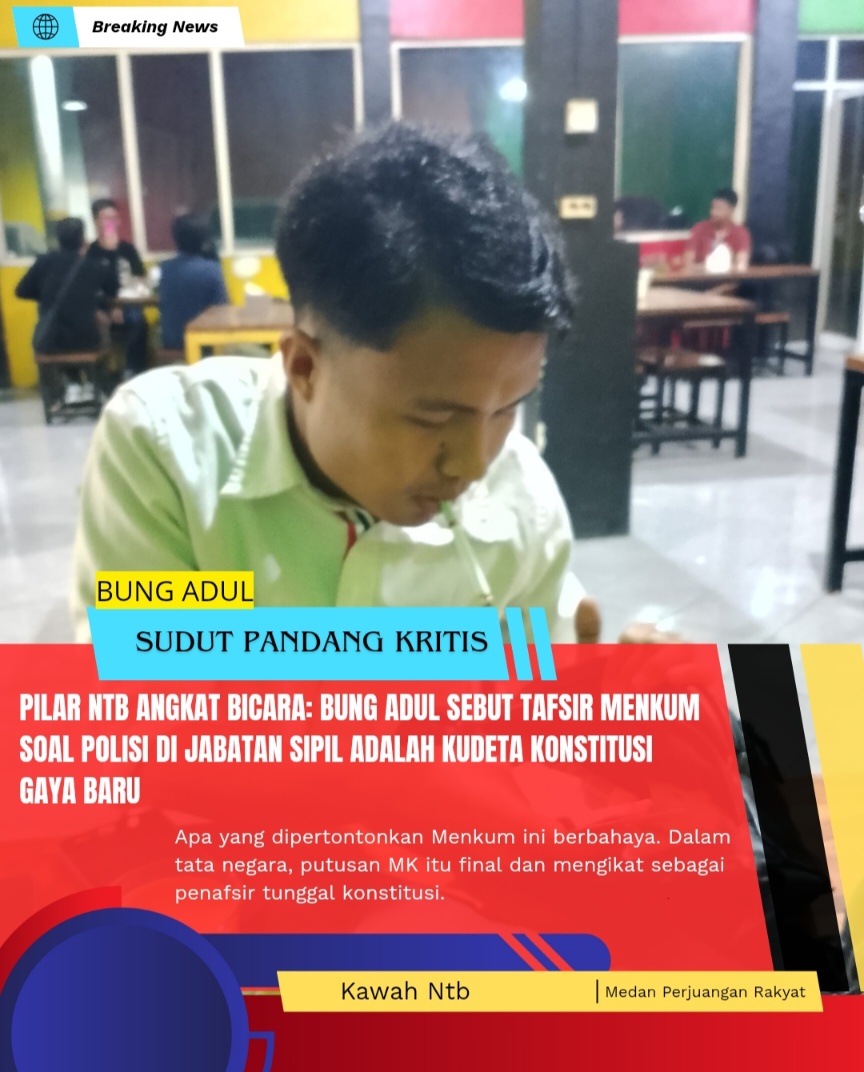 Ketua Bidang Propaganda Pilar NTB, Bung Adul, melontarkan kritik pedas yang menyoroti sisi fundamental ketatanegaraan. Ia menilai sikap Menteri Hukum (Menkum) yang ngotot mempertahankan perwira Polri aktif di jabatan sipil saat ini bukan sekadar kekeliruan administrasi, melainkan sebuah ancaman serius bagi arsitektur negara hukum Indonesia.