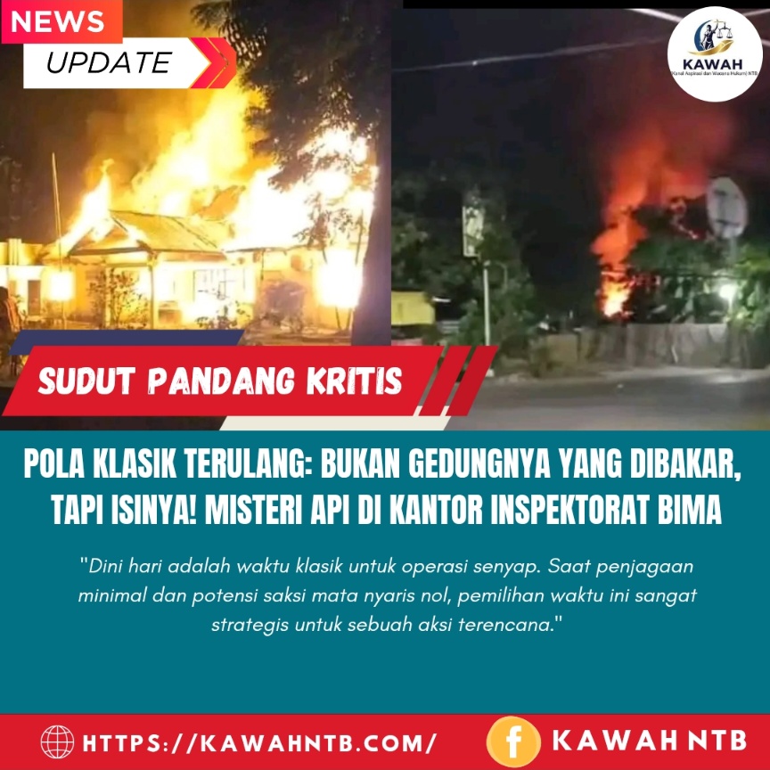 Bima, 7 Agustus 2025 || Kanal Aspirasi dan Wacana Hukum (Kawah) NTB – Kebakaran hebat yang meluluhlantakkan Kantor Inspektorat Kabupaten Bima pada Kamis (7/8/2025) dini hari, harus dibaca lebih dari sekadar musibah. Peristiwa yang menghanguskan seluruh dokumen dan arsip penting ini terlalu “sempurna” untuk dianggap sebagai kecelakaan biasa. Ini adalah sinyal kuat adanya upaya sistematis untuk menghilangkan jejak dan membungkam fungsi pengawasan. Targetnya jelas: bukan gedung yang dibakar, melainkan isi di dalamnya.