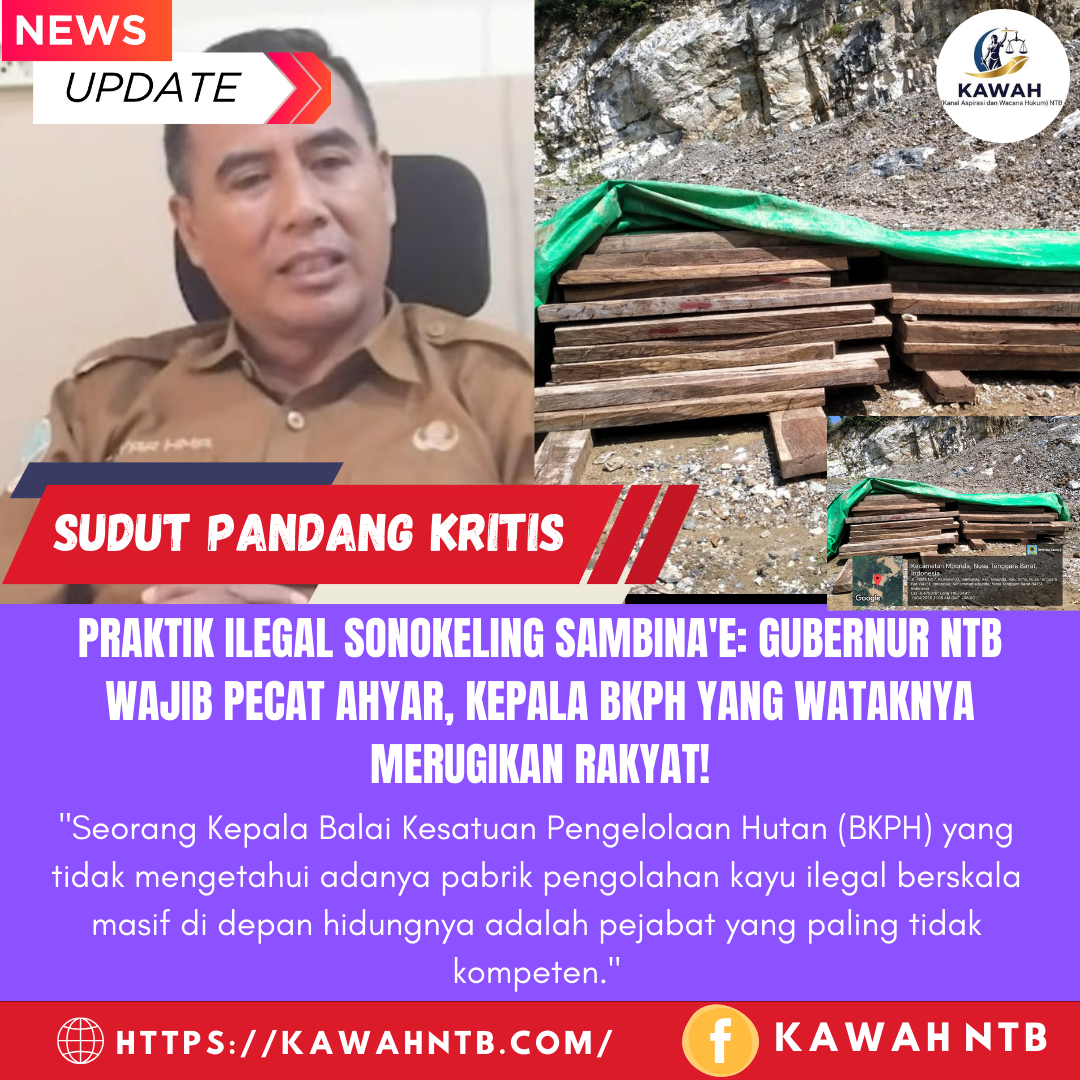 BIMA, 20 Agustus 2025 || Kawah NTB – Keheningan Kejaksaan Negeri Bima atas laporan dugaan mafia kayu Sonokeling telah membuka babak baru yang lebih krusial: Ujian kepemimpinan Gubernur NTB. Di tengah ruang hampa hukum, sorotan publik kini tertuju pada sumber masalahnya, Kepala BKPH Maria Donggo Masa, Ahyar, yang dalih “tidak tahu”-nya atas operasional pabrik ilegal di wilayahnya dianggap sebagai puncak arogansi dan kebohongan publik.