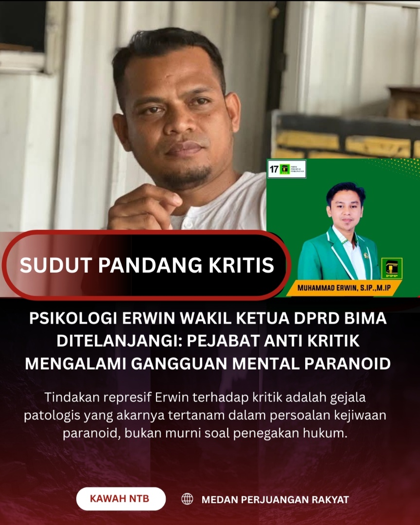 BIMA, 3 Oktober 2025 || Kawah NTB – Laporan polisi yang dilayangkan Wakil Ketua I DPRD Bima, Muhammad Erwin, terhadap aktivis kini dibedah dari sudut pandang yang jauh lebih fundamental dan mengkhawatirkan. Bukan lagi sekadar soal hukum, manuver Erwin kini dianalisis sebagai manifestasi dari ketidakstabilan psikologis seorang pejabat publik yang gagal mengelola egonya sendiri.