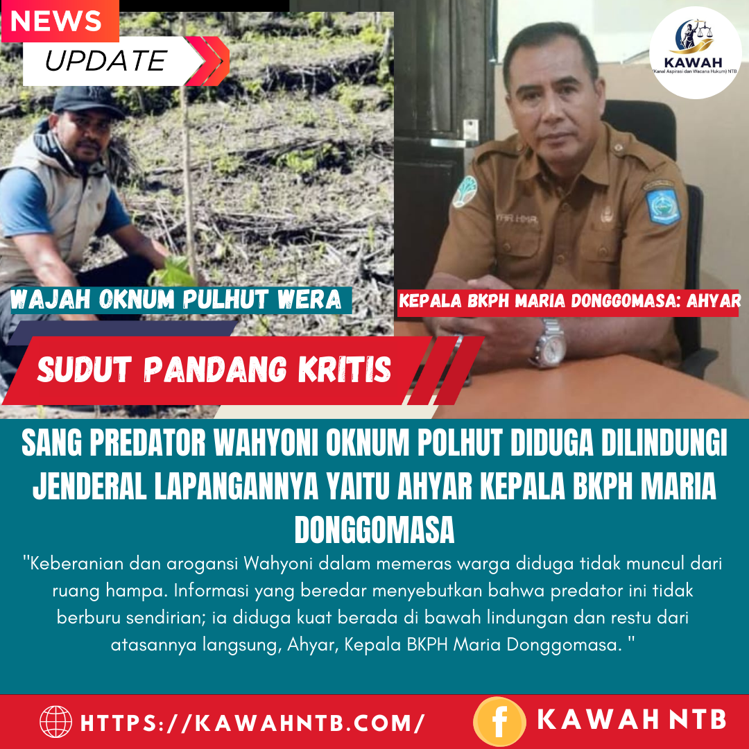 BIMA, 17 Agustus 2025 || Kawah NTB – Jika sebelumnya publik dibuat geram oleh sepak terjang Wahyoni, oknum Polhut Wera yang bertingkah laksana predator berseragam, kini terungkap fakta yang jauh lebih mengerikan. Keberanian dan arogansi Wahyoni dalam memeras warga diduga tidak muncul dari ruang hampa. Informasi yang beredar menyebutkan bahwa predator ini tidak berburu sendirian; ia diduga kuat berada di bawah lindungan dan restu dari atasannya langsung, Ahyar, Kepala BKPH Maria Donggomasa.