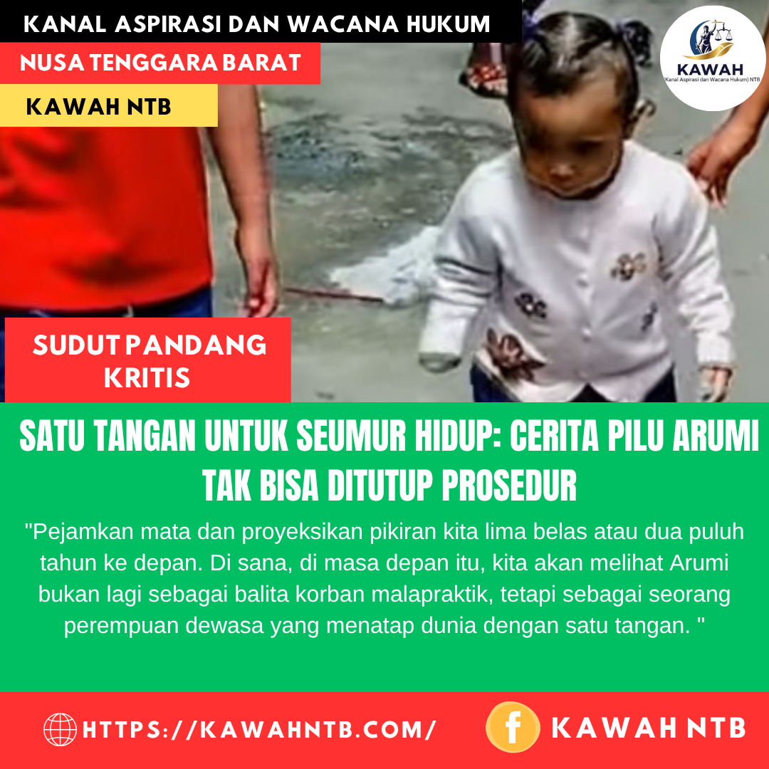 Bima, 28 Juli 2025 || Kanal Aspirasi dan Wacana Hukum (Kawah) NTB – Mari sejenak kita palingkan pandangan dari silat lidah para ahli hukum dan dinginnya ruang sidang. Mari kita tinggalkan perdebatan tentang Standar Operasional Prosedur (SOP) dan itikad baik yang kini menjadi tameng. Pejamkan mata dan proyeksikan pikiran kita lima belas atau dua puluh tahun ke depan. Di sana, di masa depan itu, kita akan melihat Arumi bukan lagi sebagai balita korban malapraktik, tetapi sebagai seorang perempuan dewasa yang menatap dunia dengan satu tangan.