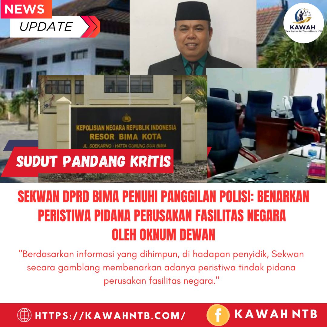 BIMA, 15 Agustus 2025 || Kawah NTB – Titik terang dalam kasus dugaan perusakan fasilitas negara yang menyeret nama oknum anggota DPRD Bima, Nurdin, semakin terlihat jelas. Proses penyelidikan yang ditangani oleh Satuan Reserse Kriminal (Satreskrim) Polres Bima Kota memasuki babak krusial setelah salah satu saksi kunci memenuhi panggilan penyidik.