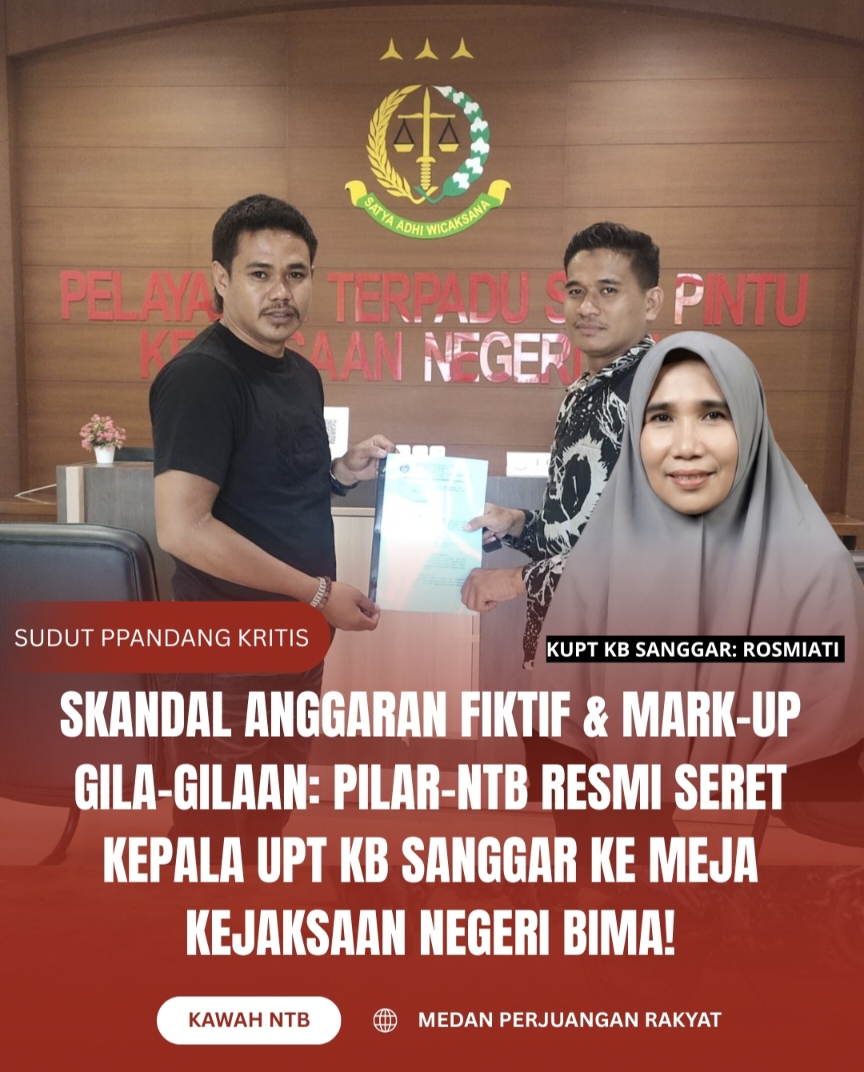 Tepat pada hari Rabu sore pukul 15:00 WITA, Lembaga Pejuang Militan Rakyat Nusa Tenggara Barat (PILAR NTB) secara resmi melaporkan Kepala UPT KB Kecamatan Sanggar, Rosmiati, ke Kejaksaan Negeri (Kejari) Bima atas dugaan kuat tindak pidana korupsi, mark-up anggaran berskala fantastis, dan pelaksanaan puluhan kegiatan fiktif pada Tahun Anggaran 2025.