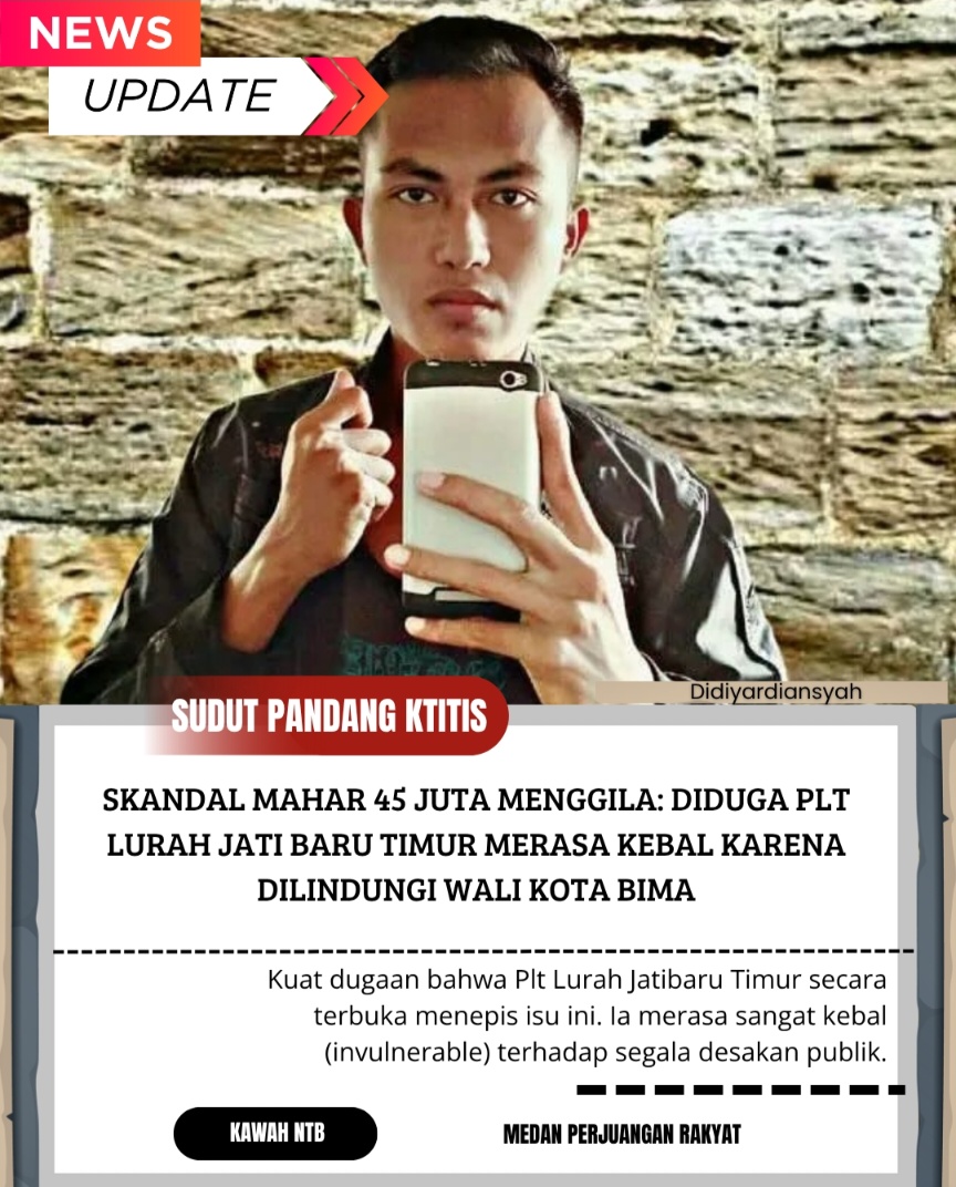 BIMA, 19 November 2025 || Kawah NTB – Polemik dugaan mahar jabatan Rp 45 juta di Kota Bima tidak lagi sekadar krisis kepercayaan; ia telah bermetastasis menjadi etalase dugaan arogansi kekuasaan yang telanjang. Sikap diam Walikota Bima, H.A. Rahman, yang awalnya dibaca sebagai upaya melindungi adiknya, kini telah melahirkan monster baru: rasa kebal hukum yang dipertontonkan oleh Plt Lurah Jatibaru Timur, Didiyardiansyah.