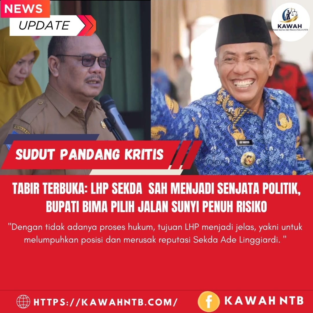 BIMA, 12 Agustus 2025 || Kawah NTB – Misteri arah politik Bupati Bima, Ady Mahyudi, terkait Laporan Hasil Pemeriksaan (LHP) Sekretaris Daerah (Sekda) Bima, Ade Linggiardi, akhirnya terjawab sudah. Namun, jawaban itu tidak datang dari konferensi pers atau langkah hukum yang tegas, melainkan dari kebisuan yang memekakkan. Sikap diam yang dipertahankan Bupati secara definitif telah mengonfirmasi skenario terburuk yang dianalisis publik: LHP tersebut telah final menjadi alat eksekusi politik, bukan instrumen penegakan supremasi hukum.