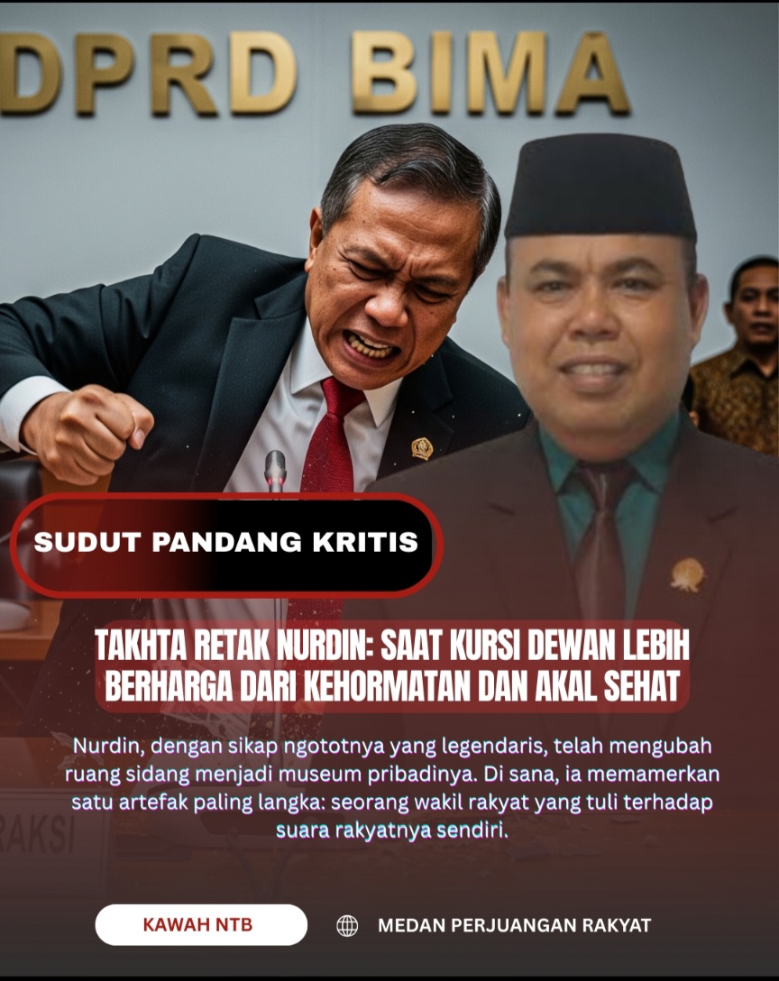 BIMA, 28 Agustus 2025 || Kawah NTB – Di panggung tragikomedi politik Bima, sebuah monumen baru tampaknya sedang dibangun. Bukan dari batu atau perunggu, melainkan dari arogansi murni dan lem perekat kekuasaan. Monumen itu adalah Nurdin, anggota DPRD dari Fraksi PKB, yang kini duduk begitu erat di kursinya seolah-olah kursi itu adalah satu-satunya benda yang tidak bisa ia hancurkan.