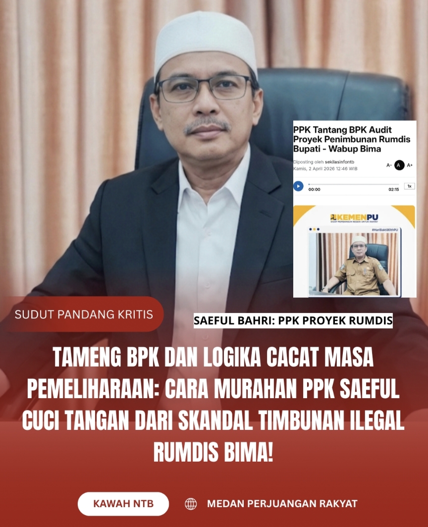 BIMA, 16 April 2026 || Kawah NTB – Reaksi Pejabat Pembuat Komitmen (PPK) proyek penimbunan Rumah Dinas Bupati dan Wakil Bupati Bima, H.M. Saeful Bahri, sebelumnya pernah memberikan klarifikasi. Namun, alih-alih memberikan klarifikasi teknis yang cerdas, sang PPK justru mempertontonkan logical fallacy (sesat pikir) tingkat dewa.
