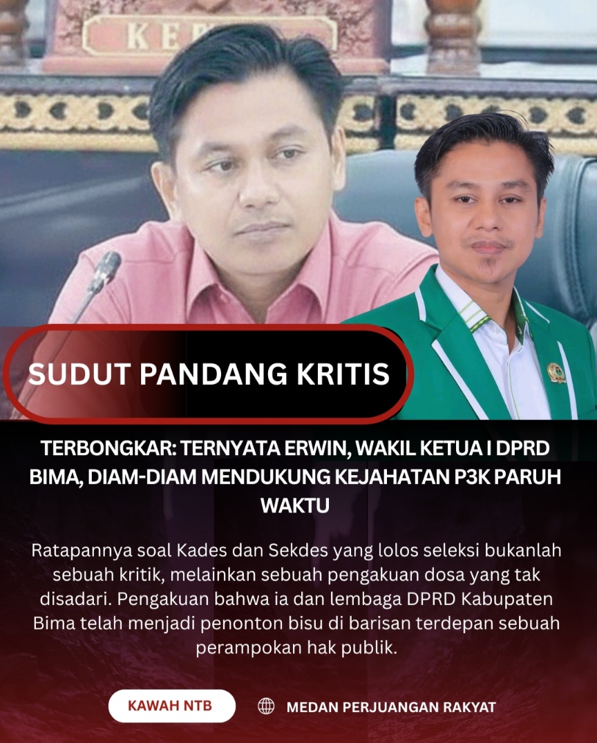 BIMA, 11 Oktober 2025 || Kawah NTB – Panggung komedi di DPRD Bima ternyata masih menyisakan satu babak lagi. Setelah kemarin Wakil Ketua I, Muhammad Erwin, memainkan peran sebagai pahlawan yang meratapi bobroknya seleksi P3K, hari ini kita perlu menelanjanginya lebih dalam. Ratapannya soal Kades dan Sekdes yang lolos seleksi bukanlah sebuah kritik, melainkan sebuah pengakuan dosa yang tak disadari. Pengakuan bahwa ia dan lembaga DPRD Kabupaten Bima telah menjadi penonton bisu di barisan terdepan sebuah perampokan hak publik.
